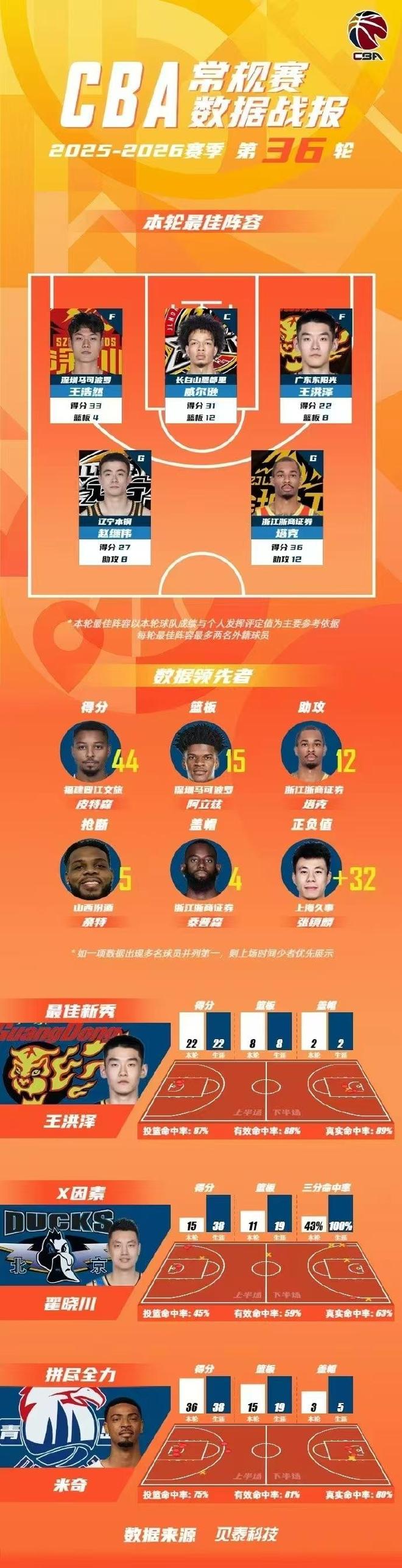 CBA官宣常规赛第36轮最佳阵容,王浩然33分创生涯纪录,率领深圳豪取11连胜创队史纪录领衔入选,威尔逊、王洪泽、赵继伟和塔克也入选最佳阵容。
