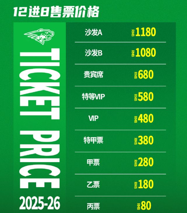 首先,辽篮季后赛首轮主场的门票一共分为9档,其中沙发(A座)的票价为1180元,沙发(B座)为1080元,贵宾席的票价为680元,特等VIP票为580,VIP票为480元,特甲票为380元,甲票为280元,乙票为180元,丙票为80元。